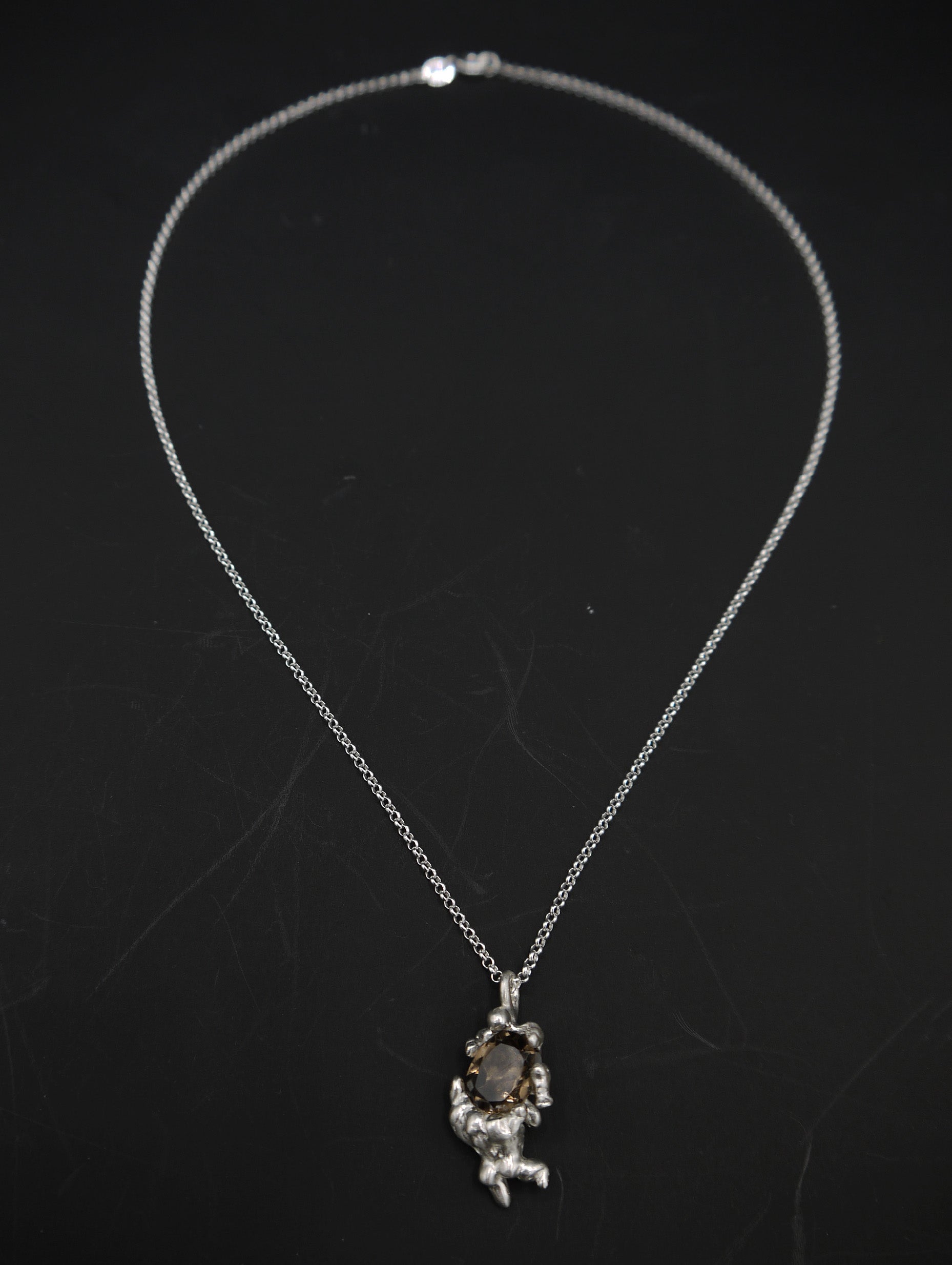 Hand made necklace featuring two floating figures dragging down a large gemstone