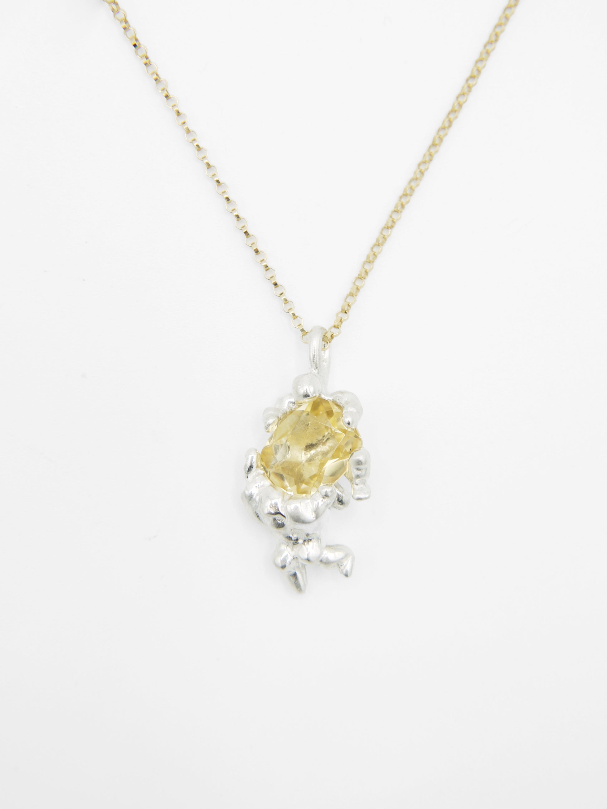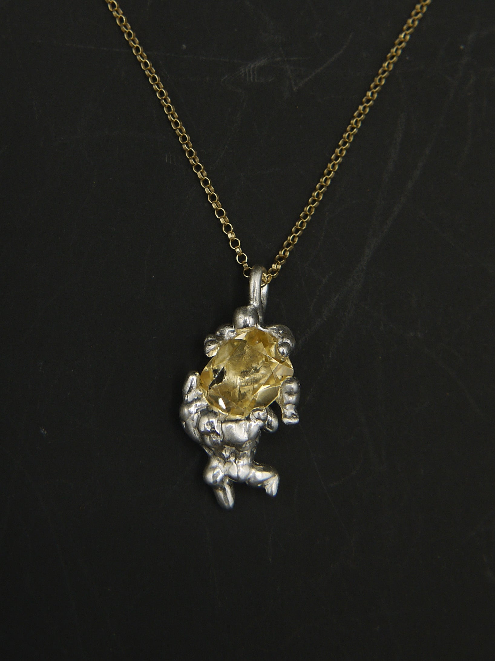 Hand made necklace featuring two floating figures dragging down a large gemstone
