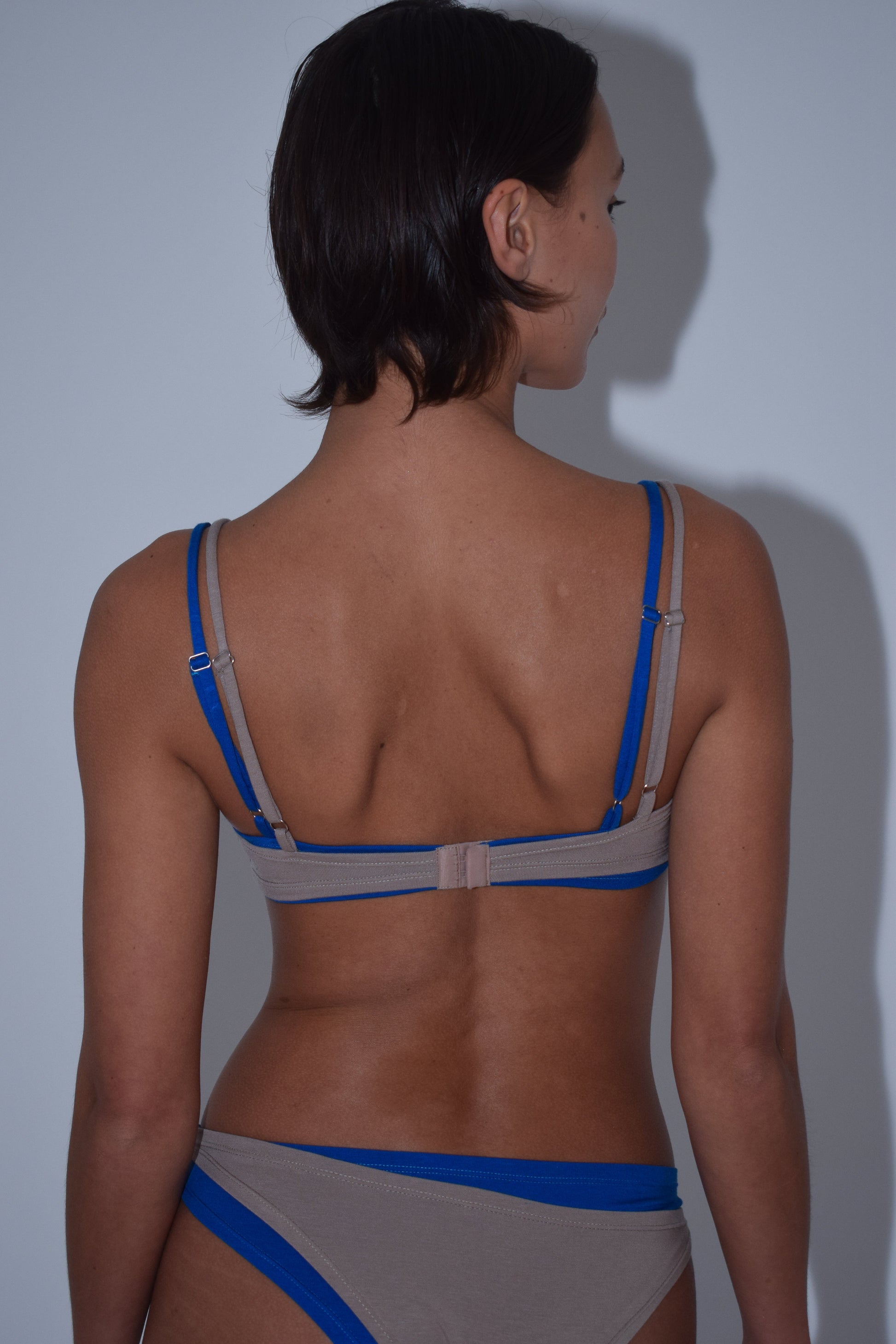 A double layered jersey bra made from the softest, sustainable bamboo jersey. This piece has been designed to conceal and reveal its under-layer, a bright pop of cobalt blue. The two layers are sewn together to be worn as one.