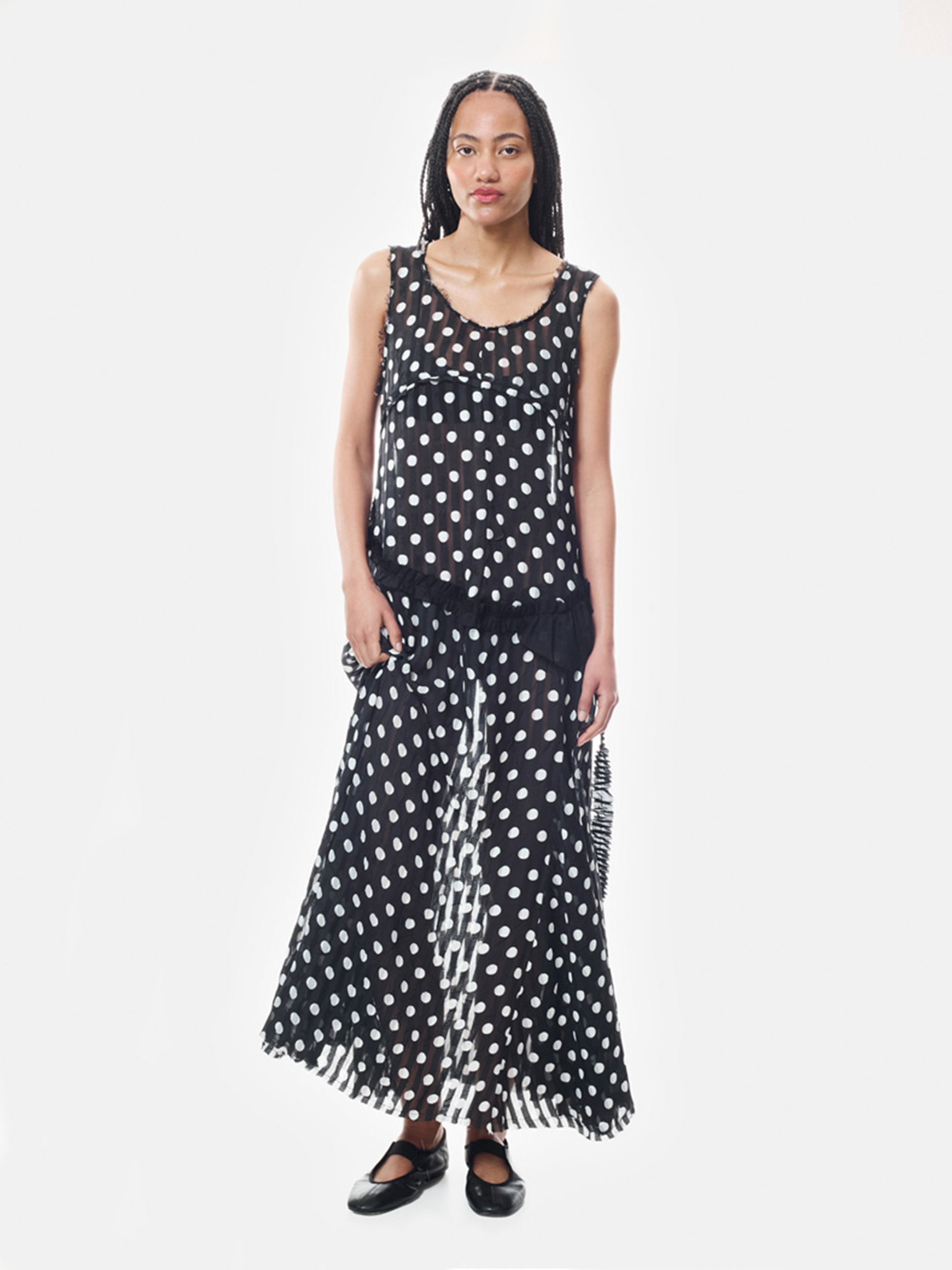 V neck polka dot maxi dress with panelled construction and contrasting godets. Loose comfortable fit. Lighweight semi transparent georgette with inside out seams details. Hipline gathered detail in contrasting Black.