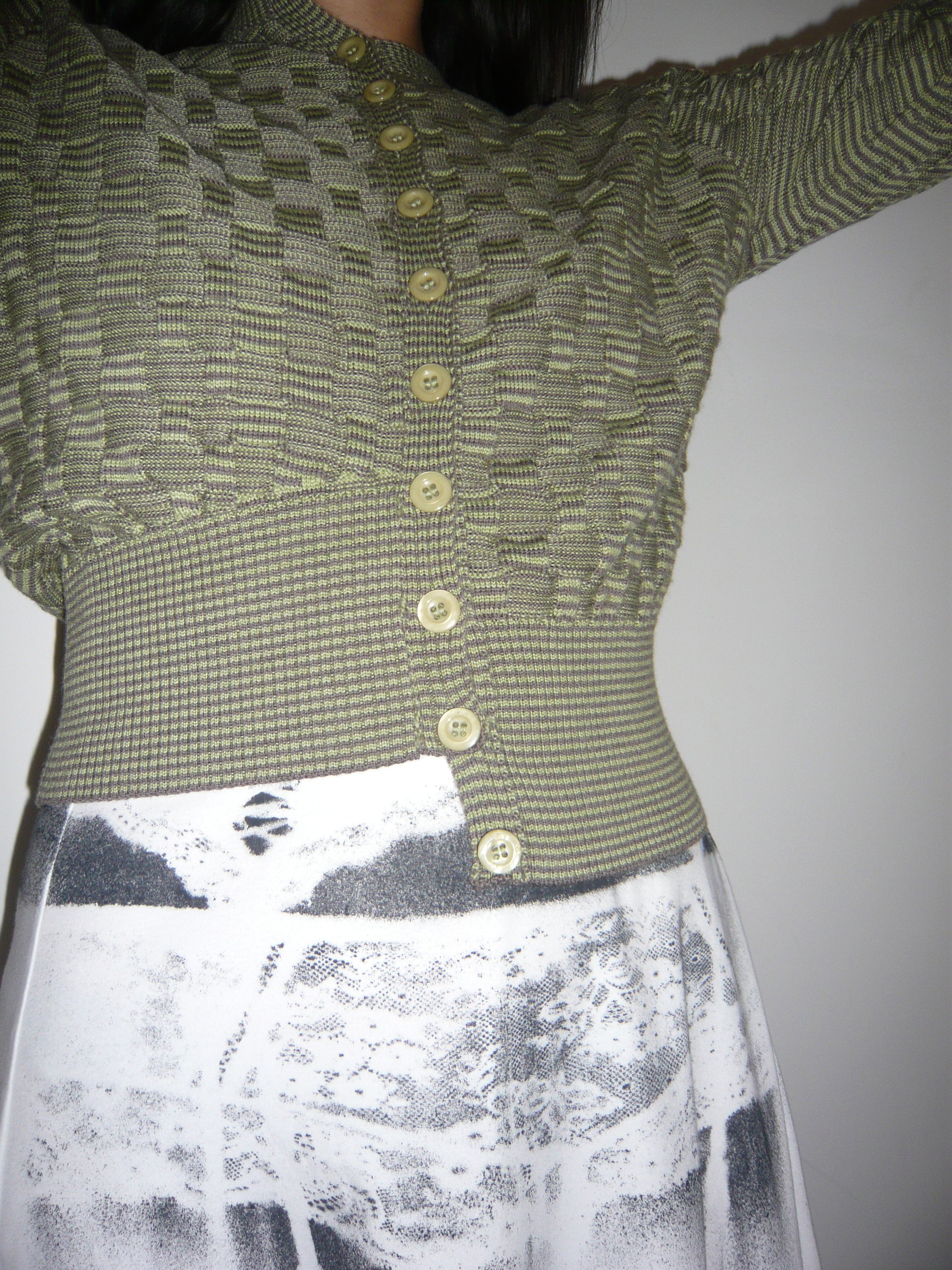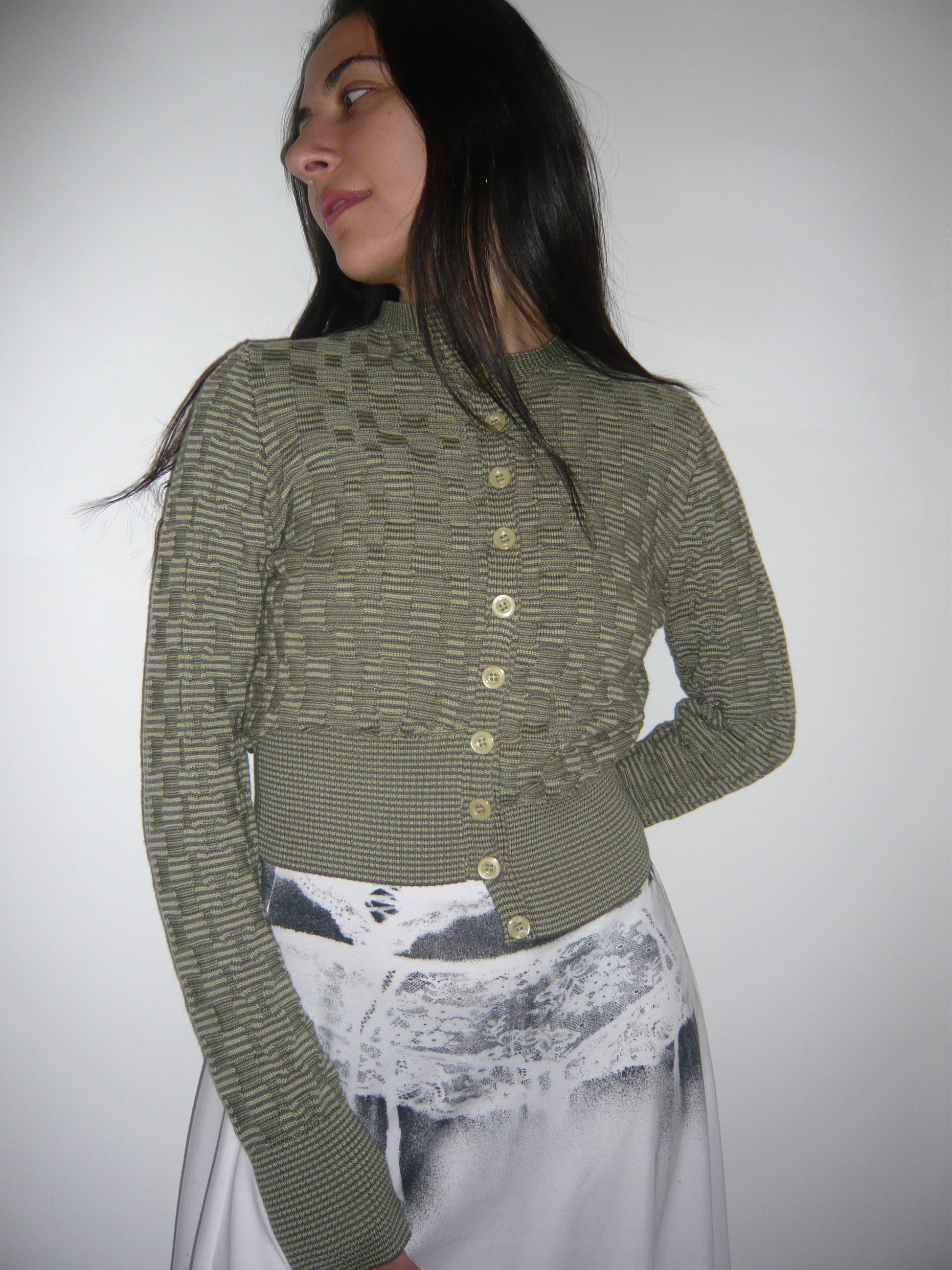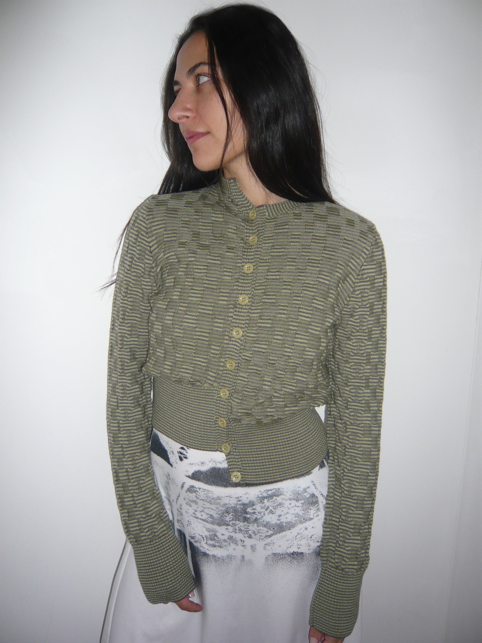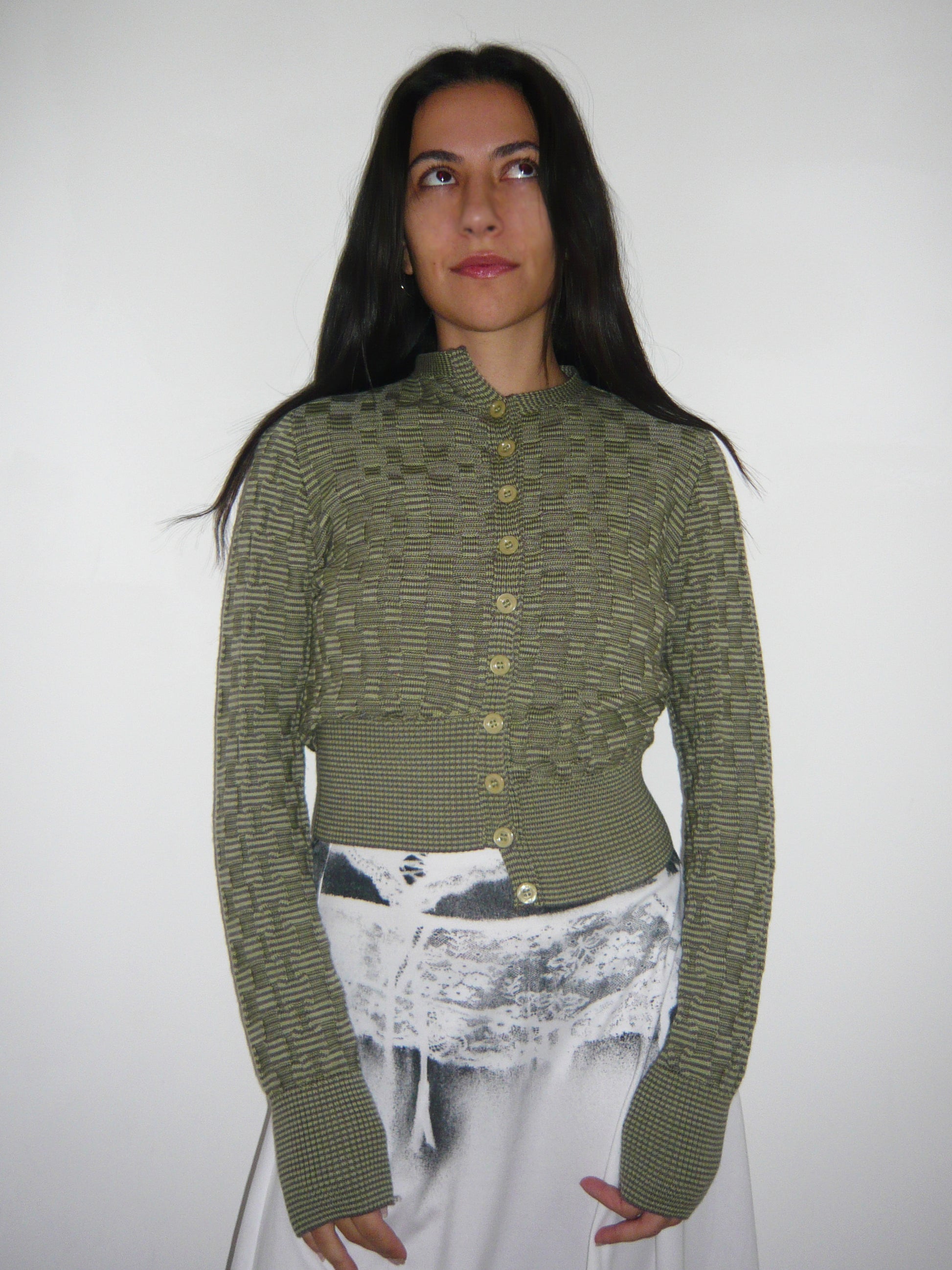 The Max Cardigan relishes the joyful asymmetry of finding the wrong button hole when fastening a cardigan.