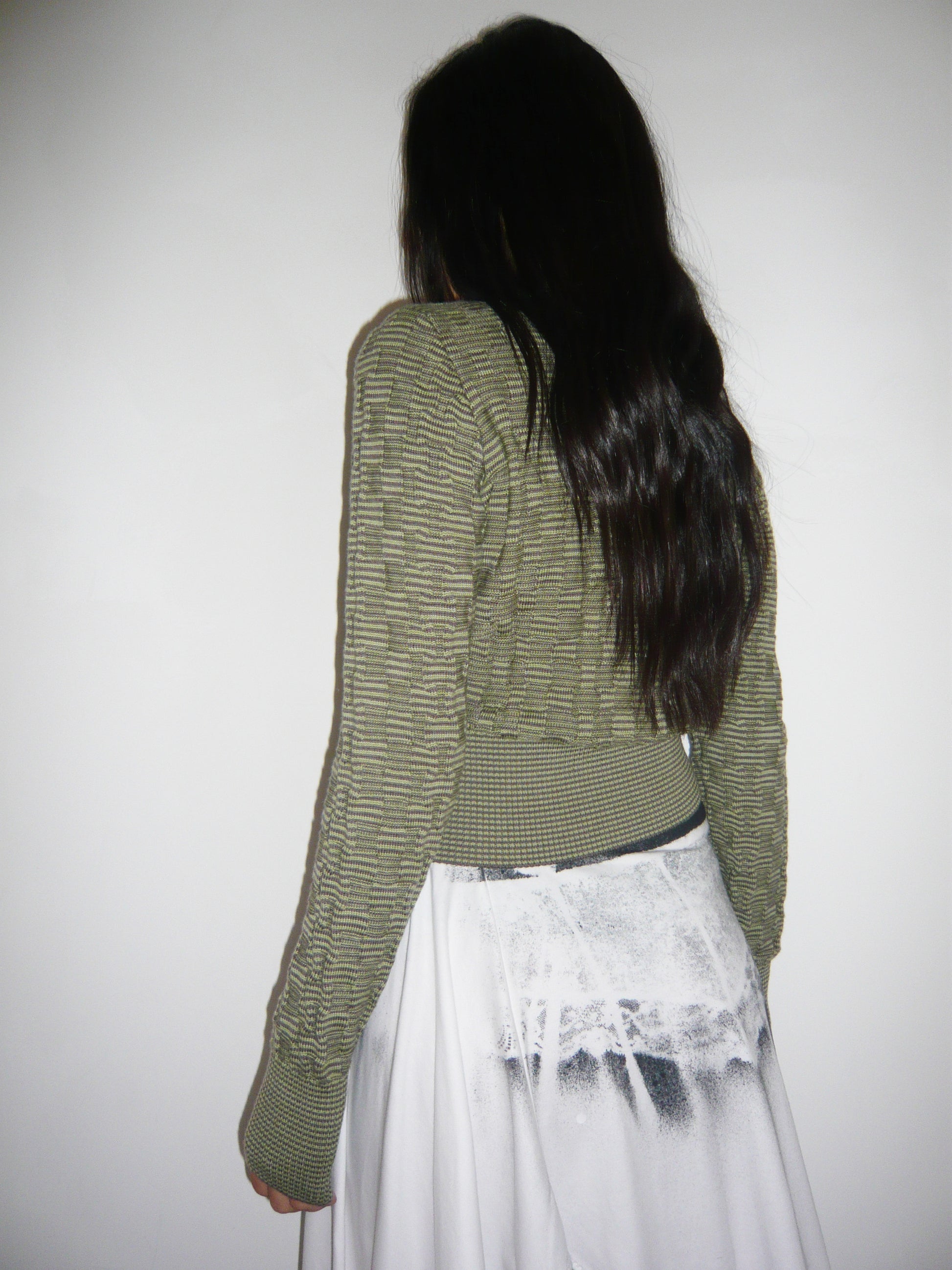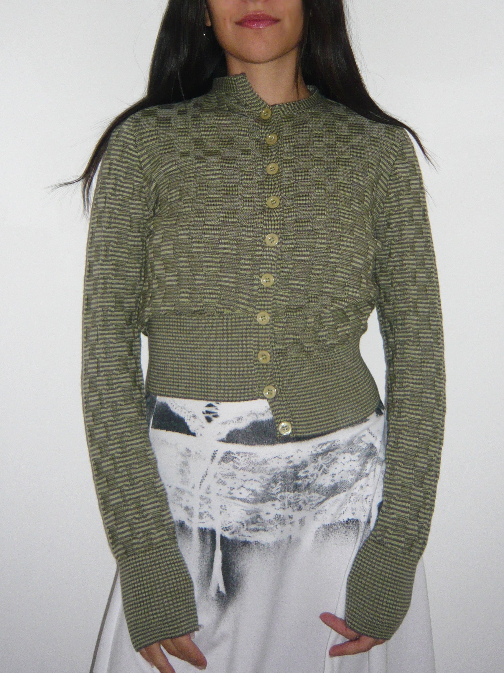 Knitted with an asymmetric right hand side body panel to allow for an intentional offset buttoning pattern.