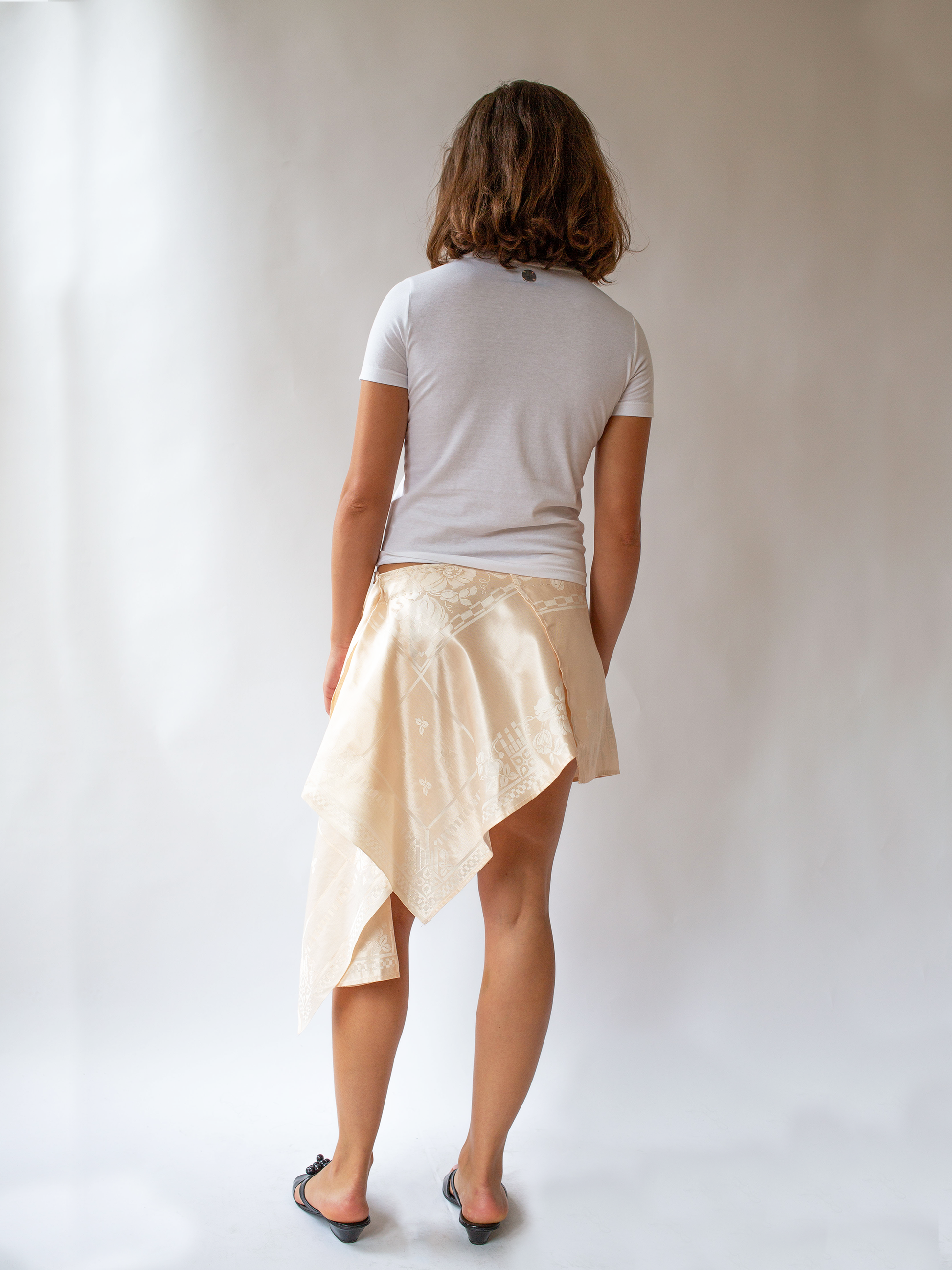 Cotton deadstock t-shirt with hand appliquéd remnant silk ribbon GD Monogram and hand stamped GD coin