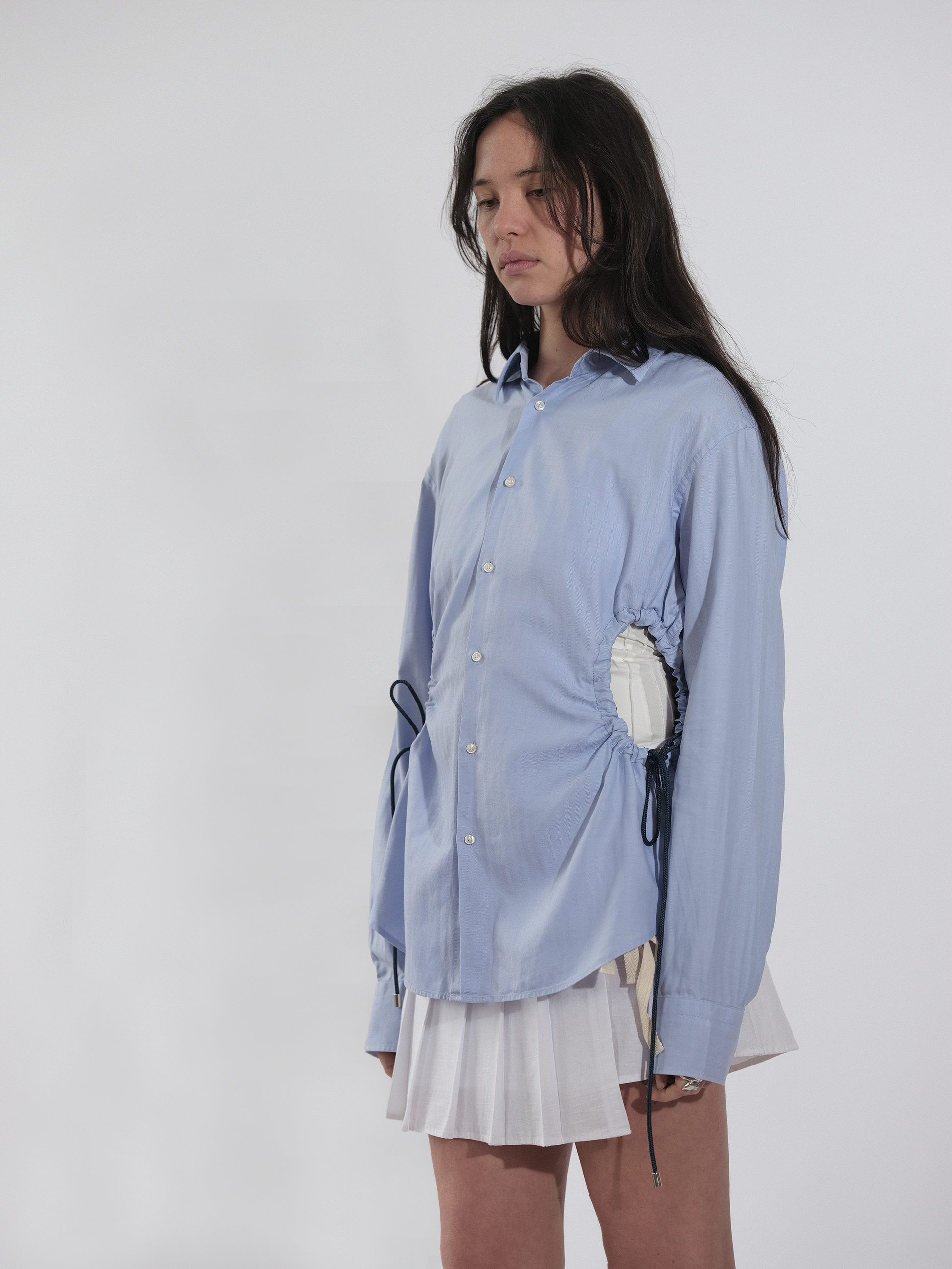 Light blue cinch shirt by upcycling London based duo Celosia Re. A one of piece with cut outs on the side and ruched ties to style.