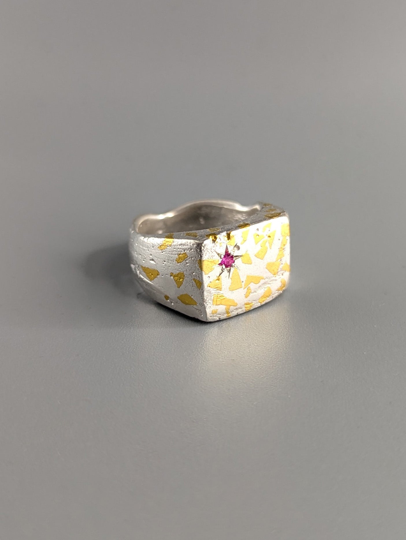 Sand cast ring made from solid 925 recycled sterling silver with Kombu 24ct yellow gold flecks, and an pink sapphire