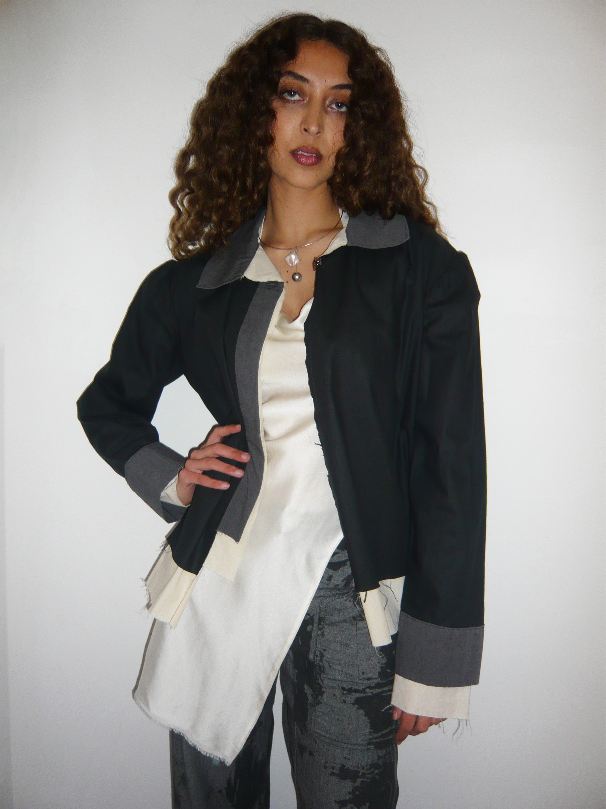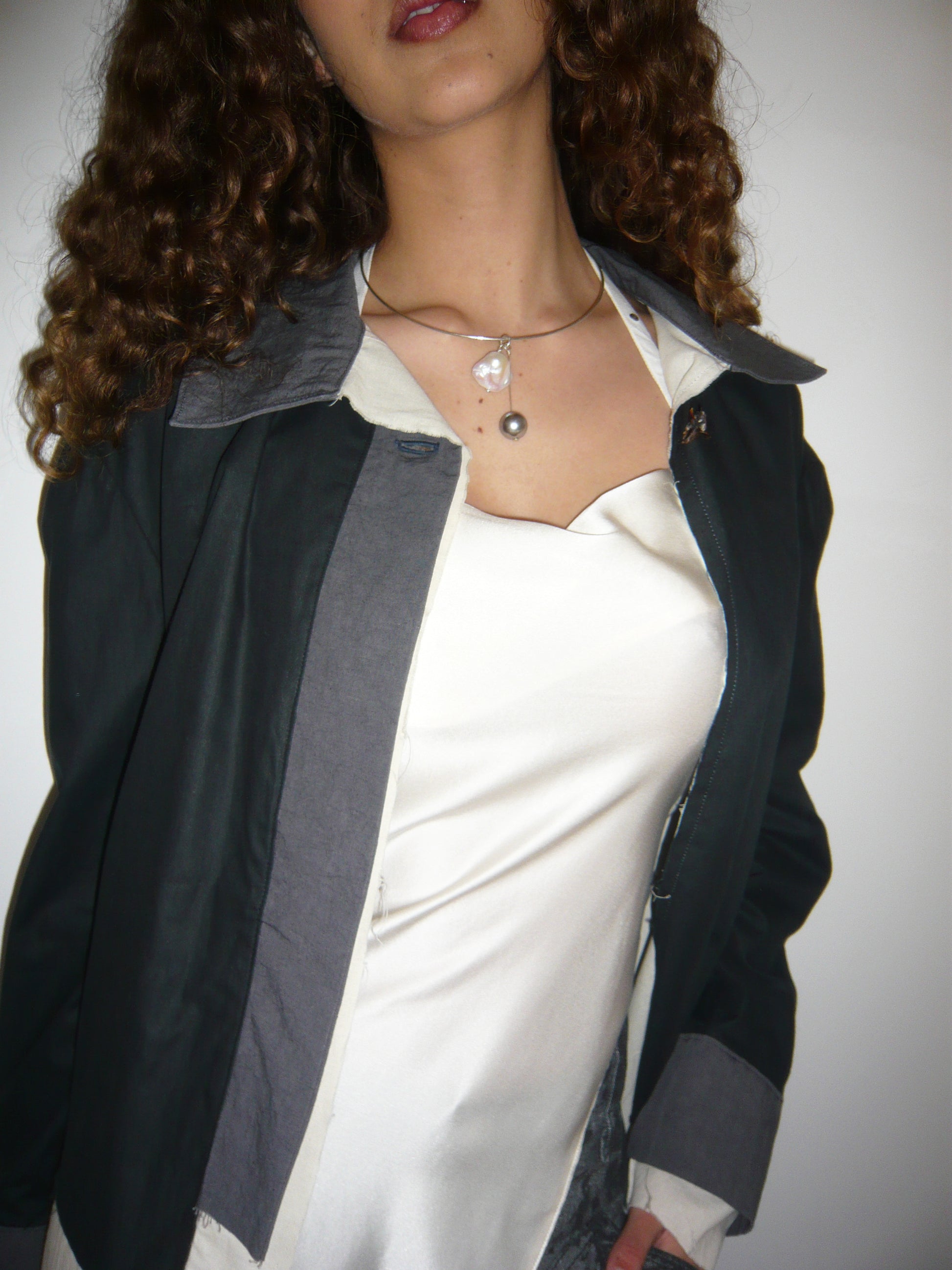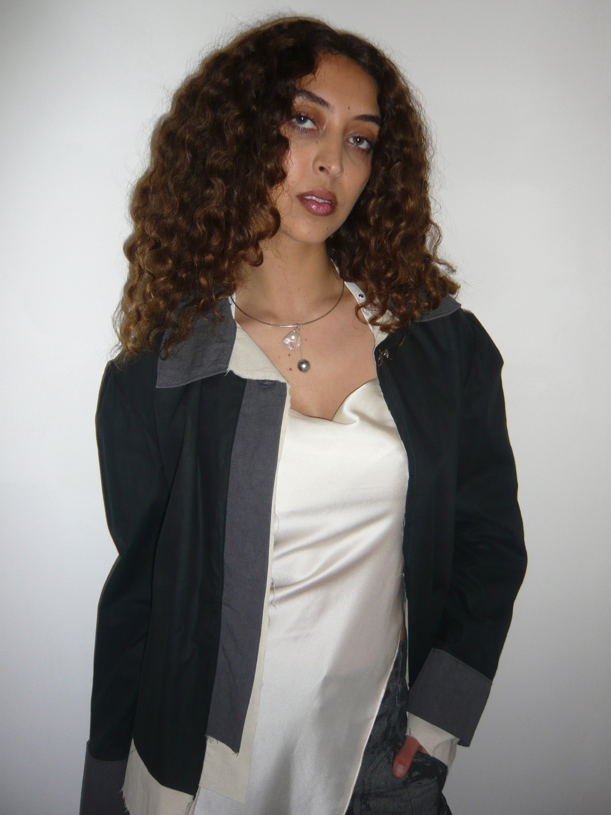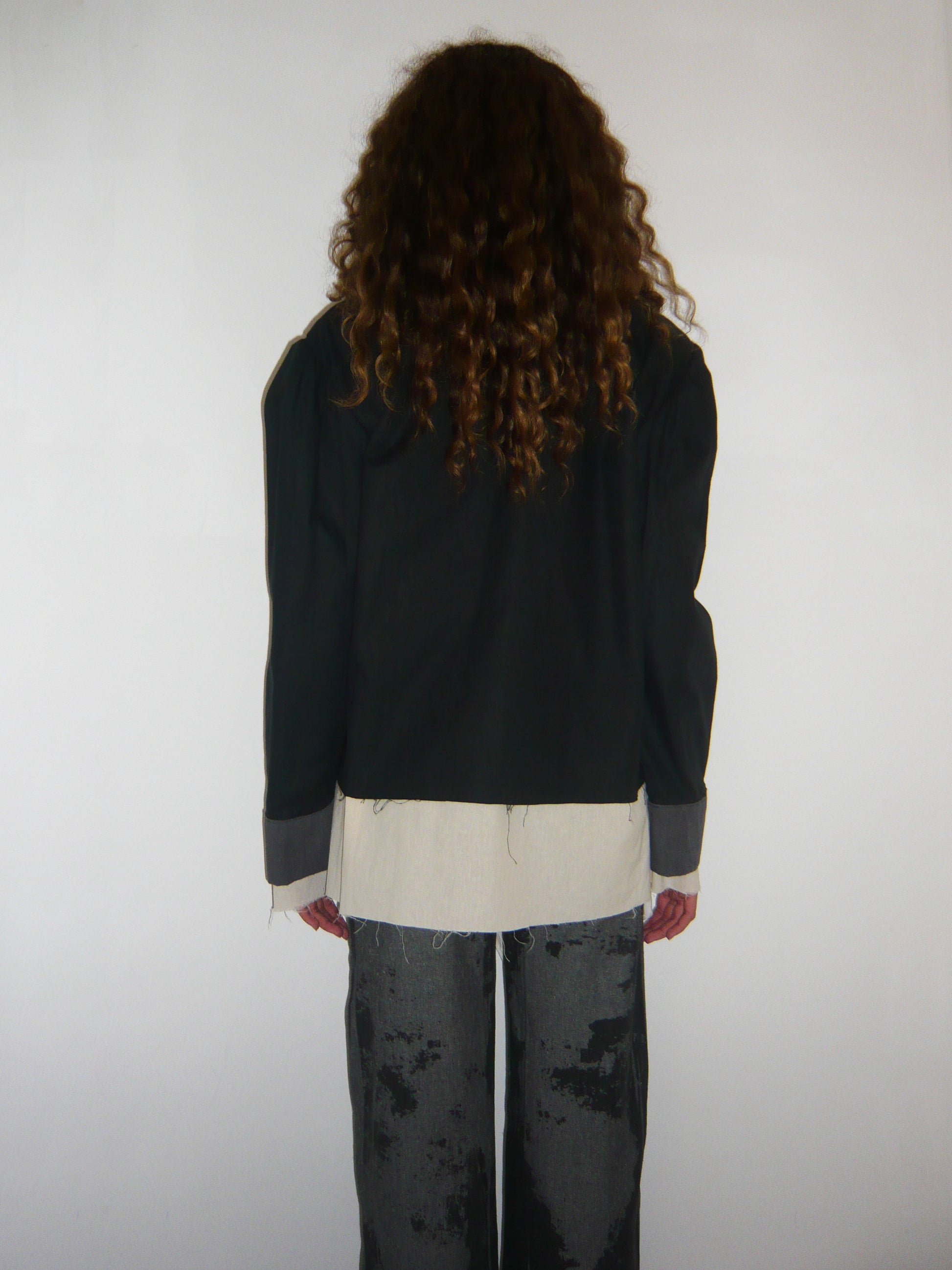 HANDMADE BASIC SHIRT WITH ONLY ONE WOODEN BUTTON. THREE DIFFERENT FABRIC LAYERS