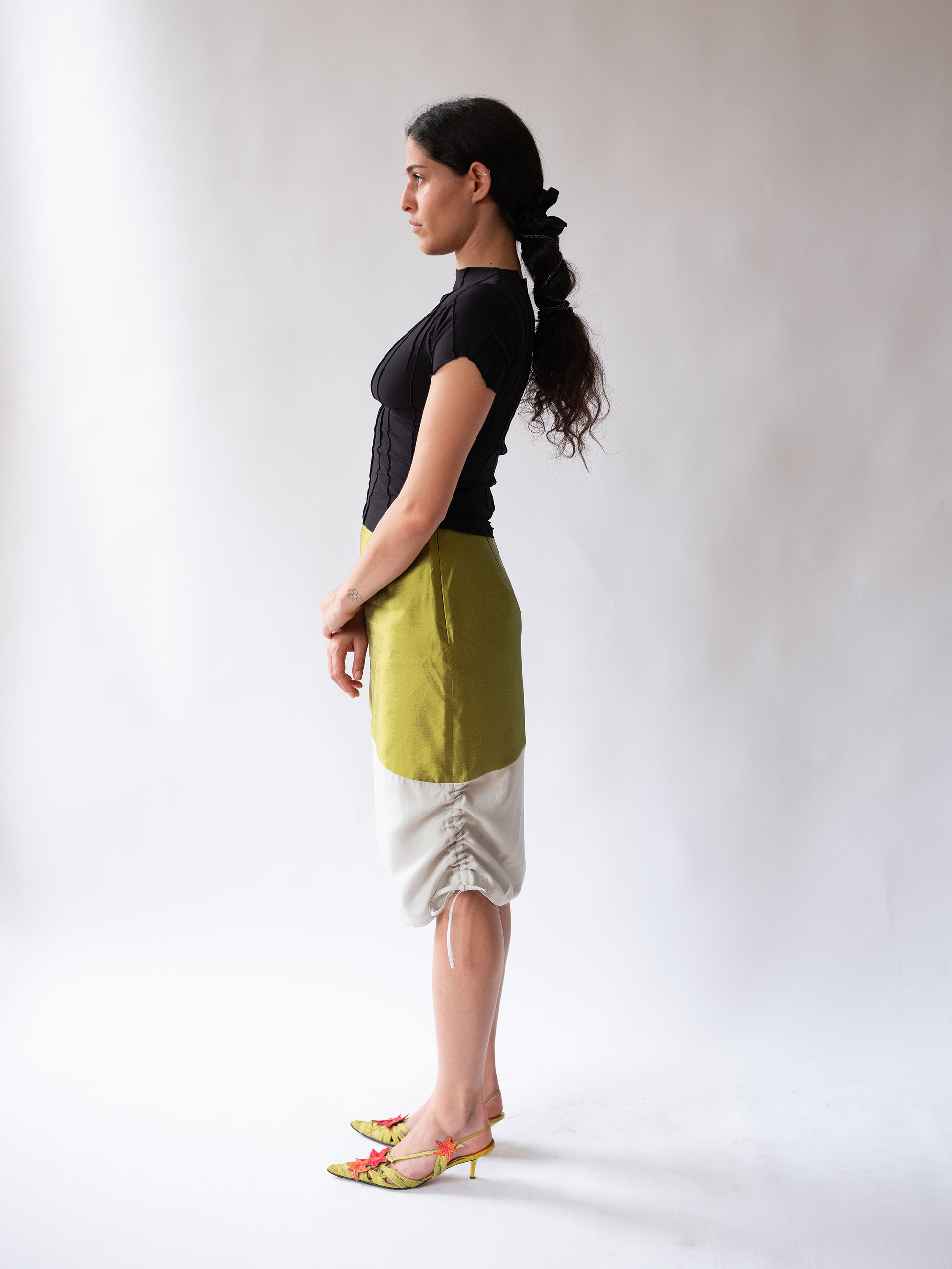 Asymmetrical skirt with ruched detail to adjust the length. pocket/belt to be purchased separately.